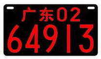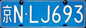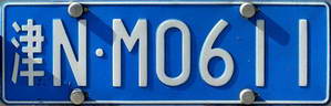 car, taxi, van, small truck 440 x 140mm 粤 = Guangzhou (Canton) K = Maoming Europlate 津 = Tianjin 京 = Beijing N = suburbs Brekke (2x) plates are blue, but some provinces use a lighter blue |