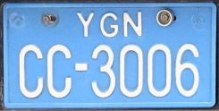 low tax taxi (with city code - these can not be changed back to black plates because of the low tax) used CC - HH MDY = Mandalay Francoplaque old AA series (2012), now with city name YGN = Yangôn (Rangoon) Aaron old AA series (1995), no free import permit, got RA and RB Aaron |